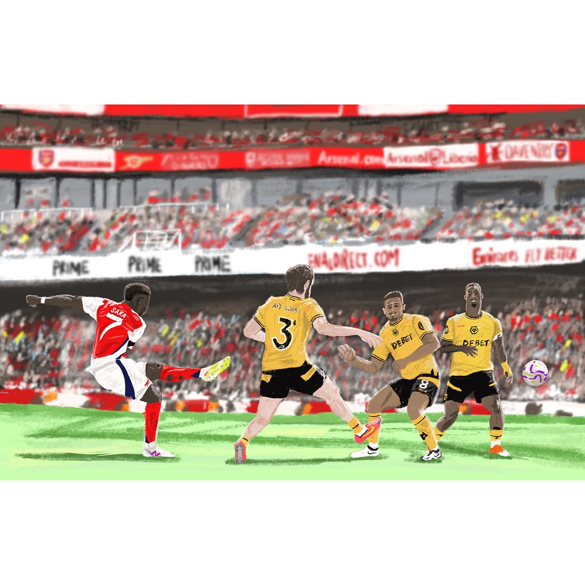 ウルブス戦でのサカのシュート。その体。どうなってるの。という美しいフォーム。美しいシュートで始まったシーズン初戦。